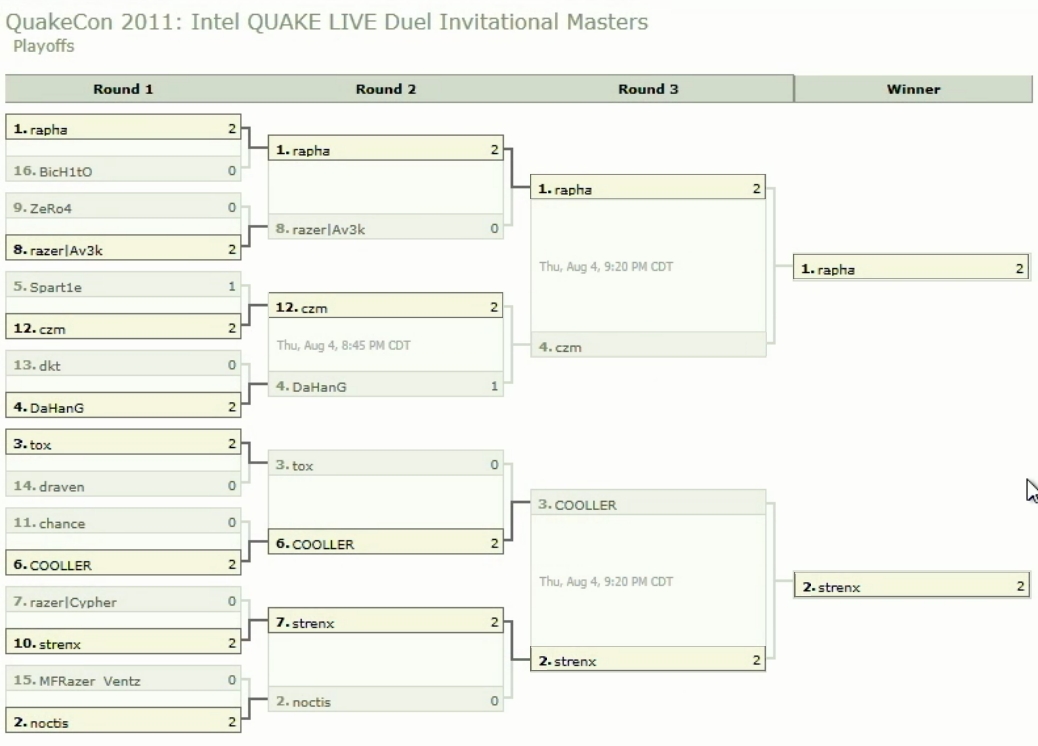 Official CompetitionsEach year, QuakeCon plays host for some of the most exciting electronic gaming competitions in the world. Players travel from around the globe for a chance at the prize money and bragging rights that come with a QuakeCon victory. This year, QuakeCon 2011 features three official tournaments: * Intel® QUAKE LIVE® Duel Invitational Masters * Intel® QUAKE LIVE® Team Deathmatch Invitational Masters * Brink® Open Championships quakecon.org QuakeCon2011 Live Stream mehr... |